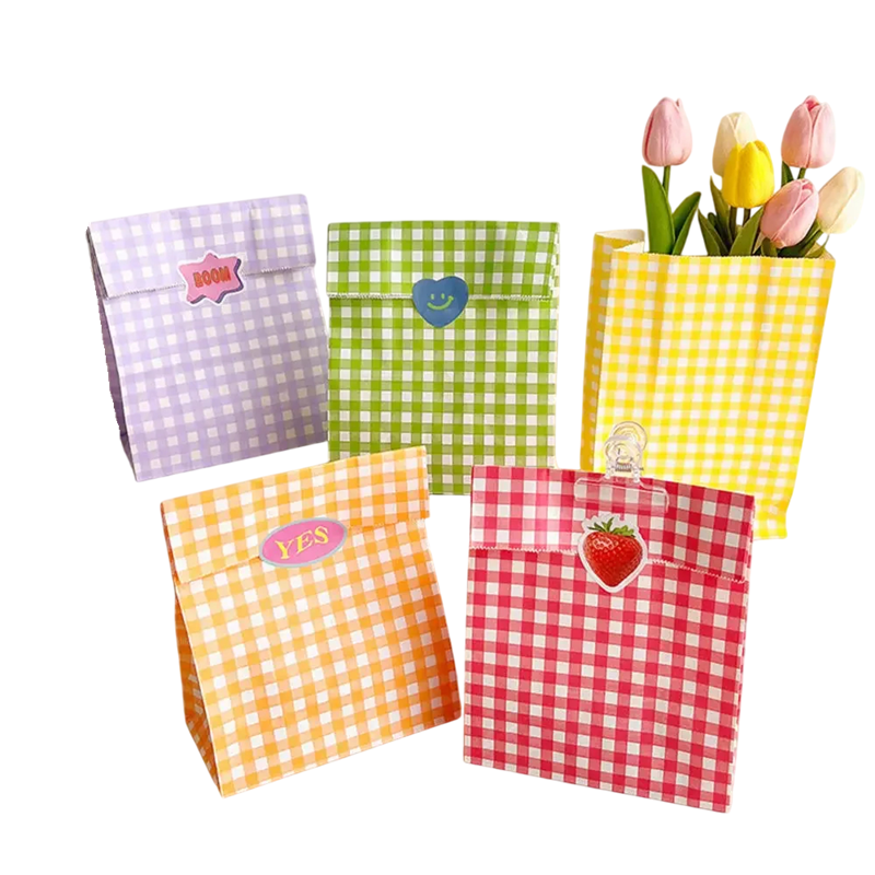 Fiecare pungă are un design în carouri vibrant în culori variate, ceea ce îi conferă un aspect elegant, jucăuș și festiv. Sunt potrivite atât pentru copii, cât și pentru adulți și completează perfect decorul oricărei evenimente. Hârtia de calitate asigură că pungile își mențin forma și se pliază și se închid cu ușurință. Baza lor naturală, combinată cu imprimeul colorat, creează un aspect modern, dar ecologic, care se potrivește diferitelor ocazii.