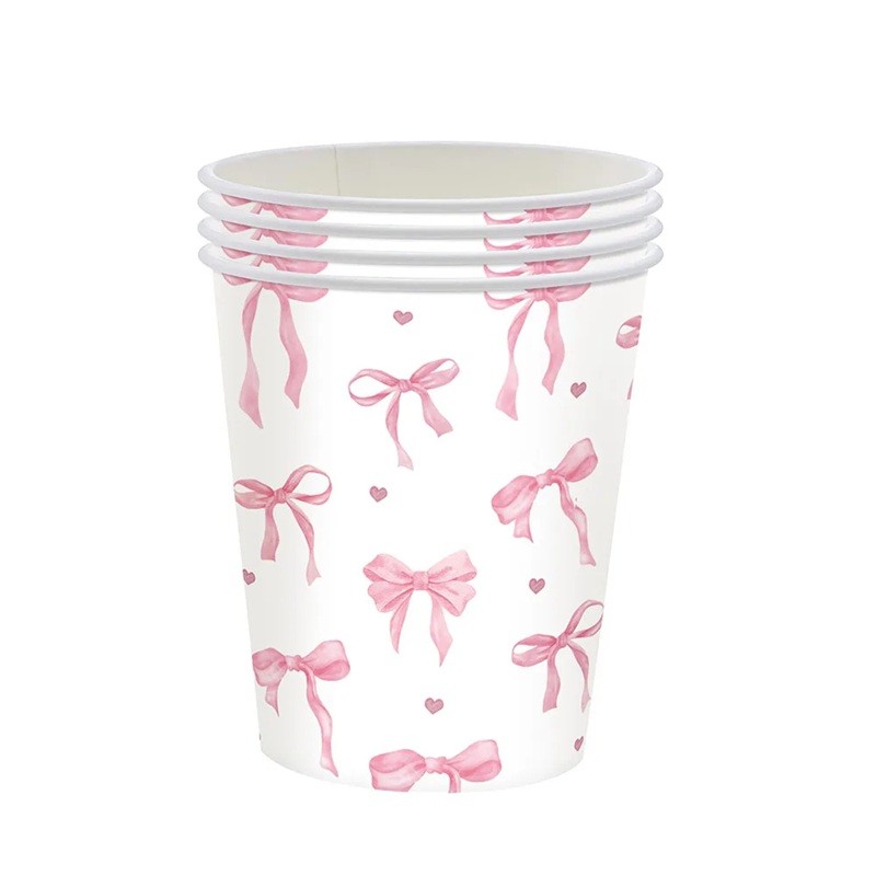 Căni de hârtie cu motiv de fundițe roz și inimioare sunt un accesoriu frumos pentru servirea festivă. Designul romantic delicat va adăuga o notă elegantă și jucăușă fiecărei sărbători. Aceste căni de petrecere sunt perfecte pentru sărbătorile de ziua de naștere, baby shower, petreceri pentru fete sau baruri tematice de dulciuri.