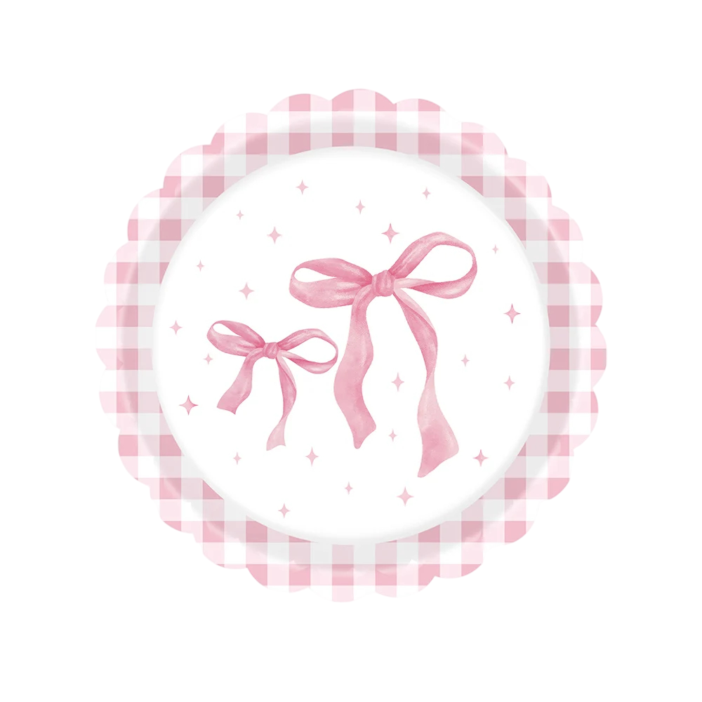 Farfurii de hârtie stilate cu motive de fundițe roz sunt un accesoriu ideal pentru orice sărbătoare de aniversare, baby shower sau petrecere tematică. Designul delicat cu fundițe și marginea în carouri oferă decorului de masă un aspect elegant și jucăuș. Datorită dimensiunii lor, farfuriile sunt perfecte pentru servirea tortului, deserturilor, dulciurilor sau gustărilor mai mici.