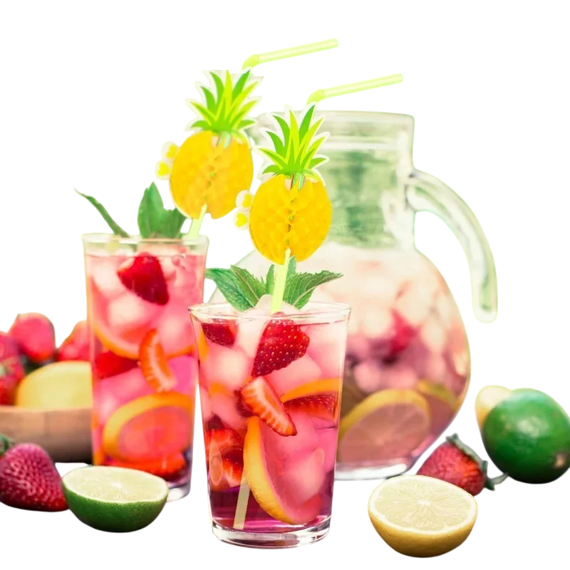 Încântați-vă băuturile cu un stil tropical și vesel cu aceste canoane decorative cu ananas. Se potrivesc perfect pentru sărbători de vară, nunți, petreceri la piscină, petreceri pe plajă și evenimente tematice. Canoanele colorate din plastic sunt decorate cu o figură de ananas, care va oferi fiecărei băuturi un aspect exotic și o atmosferă de vacanță. Fabricate din plastic sigur pentru alimente, rezistent, canoanele sunt spălabile și reutilizabile, astfel încât le puteți folosi la multe alte evenimente. Sunt ideale pentru cocktailuri, sucuri, limonade și alte băuturi răcoritoare.