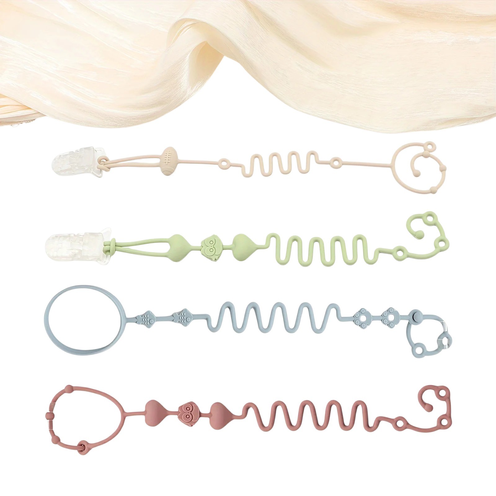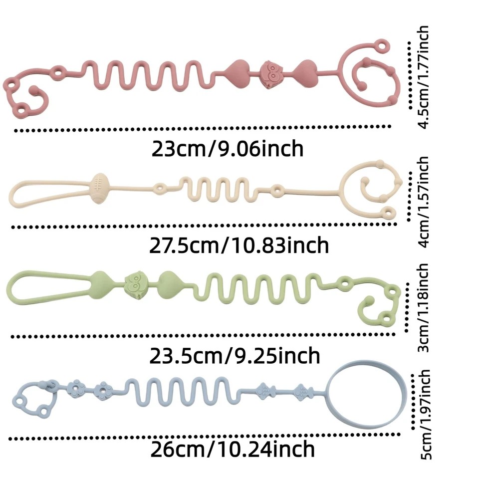 4 bucăți de șnururi din silicon pentru suzete și jucării Diverse dimensiuni și culori Pentru suspendare pe cărucior sau pătuț Fixare sigură a sticlei și altor obiecte Setul de patru șnururi din silicon este un ajutor practic pentru părinți, care doresc să aibă suzetele, jucăriile, sticlele și alte obiecte întotdeauna la îndemână. Șnururile sunt concepute pentru a preveni căderea și pierderea obiectelor în timpul plimbărilor și utilizării acasă.