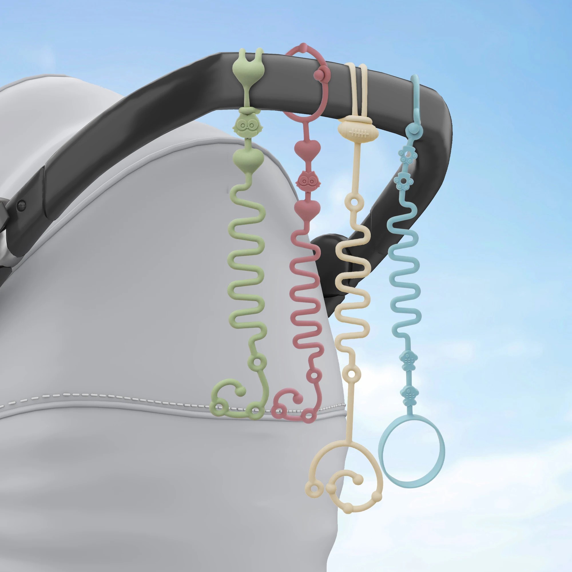 Diverse dimensiuni și culori permit alegerea șnurului potrivit în funcție de nevoie și asortarea acestuia cu căruciorul sau echipamentul. Fiecare șnur se poate agăța ușor de cărucior, pătuț sau geantă, oferind astfel utilizare universală.