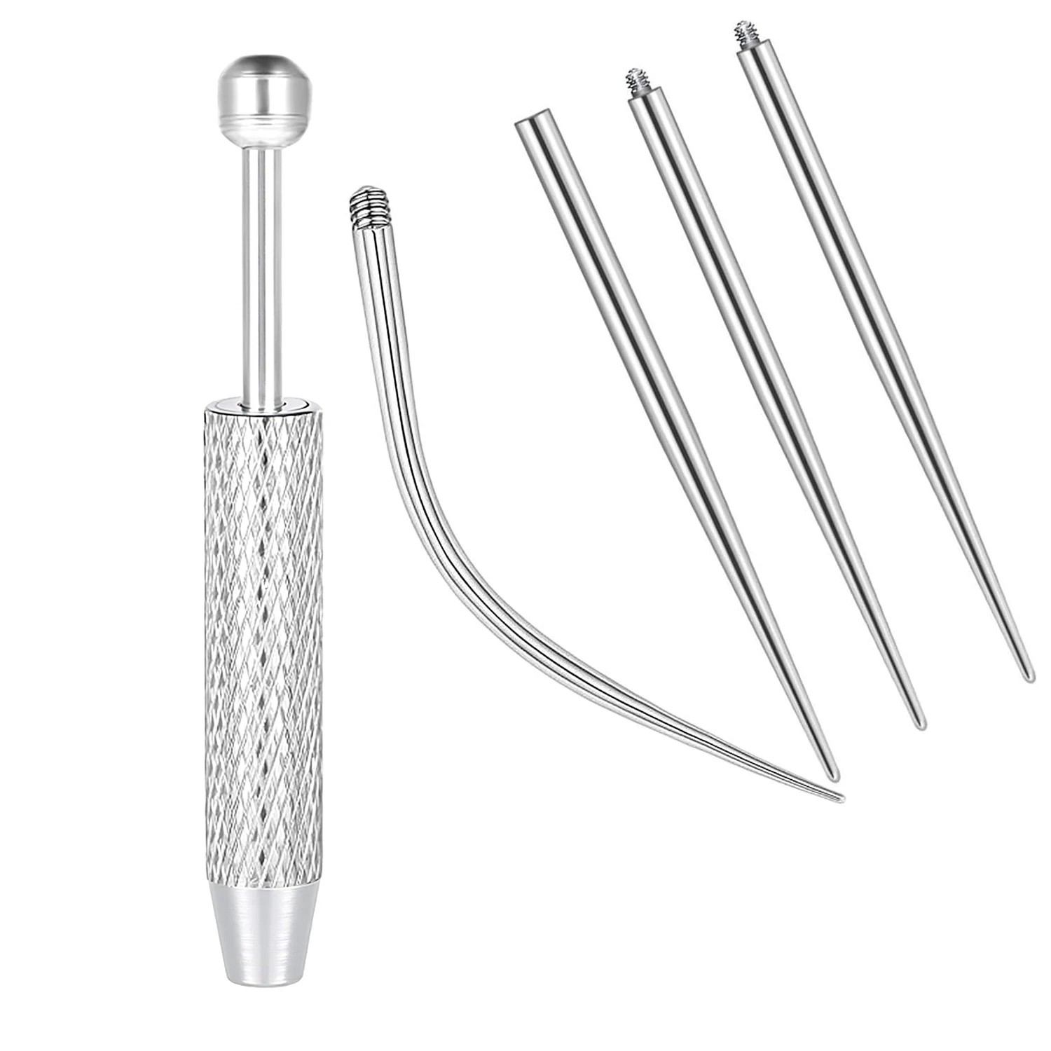 Această set de cozi este destinat utilizatorilor care caută un instrument practic și clar pentru manipularea bijuteriilor de piercing. Forma conică curbată permite introducerea lină a bijuteriei în punctul de piercing și ajută la precizarea întregului proces de schimbare. Titanul utilizat este ușor și se ține bine, ceea ce contribuie la manipularea confortabilă. Instrumentul este proiectat având în vedere utilizarea universală pentru diferite părți ale corpului. Datorită dimensiunilor compacte, se depozitează ușor și este întotdeauna la îndemână.