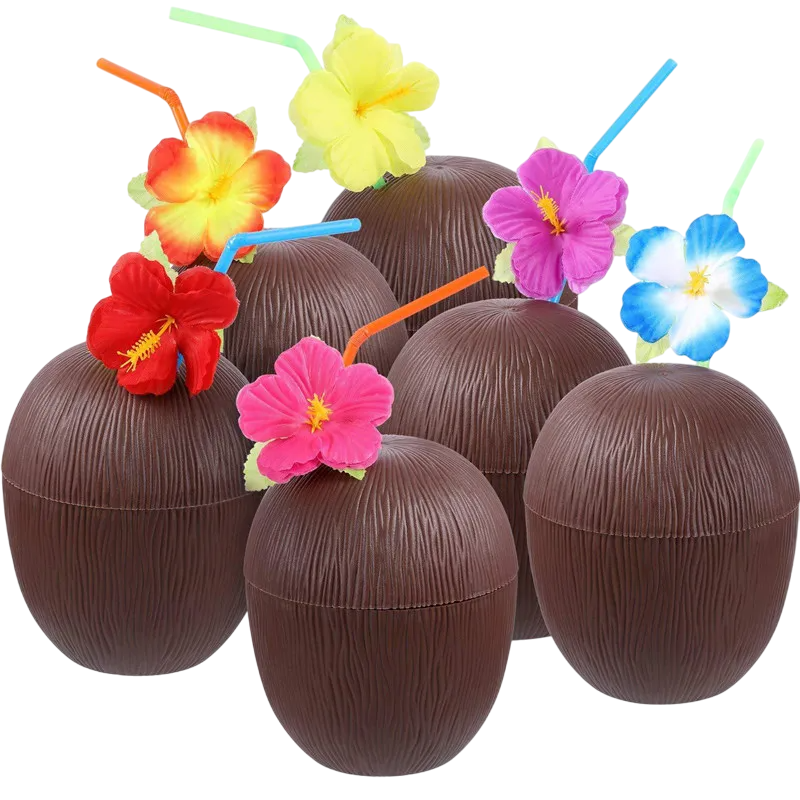 Adu un accent tropical sărbătorilor tale cu aceste cupe originale din plastic în formă de nucă de cocos. Sunt ideale pentru servirea sucurilor, cocktailurilor și băuturilor răcoritoare în timpul sărbătorilor de vară, nunților, zilelor de naștere, petrecerilor pe plajă sau serilor la piscină. Designul autentic al nucii de cocos creează o atmosferă plăcută și completează perfect decorațiunile tematice. Datorită construcției ușoare și rezistente din plastic, cupele sunt reutilizabile, ușor de curățat și sigure pentru utilizarea de către copii. Acestea sunt nu doar un recipient practic pentru băuturi, ci și un element decorativ pentru servire.