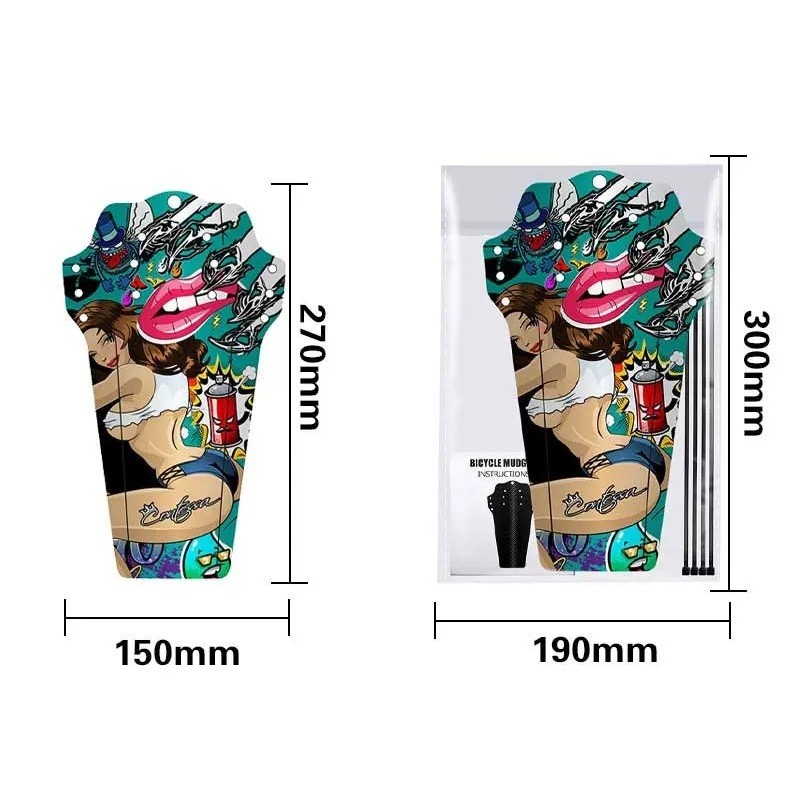 Designul apărătoarei este expresiv și colorat, cu un motiv în stil comic. Pe motiv se află o femeie, buze proeminente, craniu și alte elemente în stil graffiti și ilustrație stradală. Acest aspect este ideal pentru cicliști care doresc ca bicicleta lor să aibă un aspect personalizat și să se deosebească de accesoriile obișnuite de o singură culoare. Motivul este bine vizibil și are un impact dinamic chiar și de la distanță.