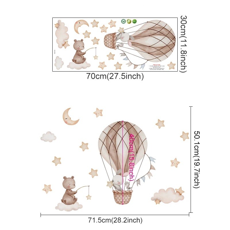 Această design cu ursulețul și iepurașul în balon creează o atmosferă liniștitoare și visătoare, ideală pentru dormitoarele copiilor, grădinițe sau colțuri de joacă. Autocolantul este rezistent la deteriorare, nu se decolorează și își păstrează aspectul pe termen lung. Datorită nuanțelor pastelate delicate și aspectului natural al vinilului, se potrivește în orice stil de interior – de la modern la clasic în camera copiilor.