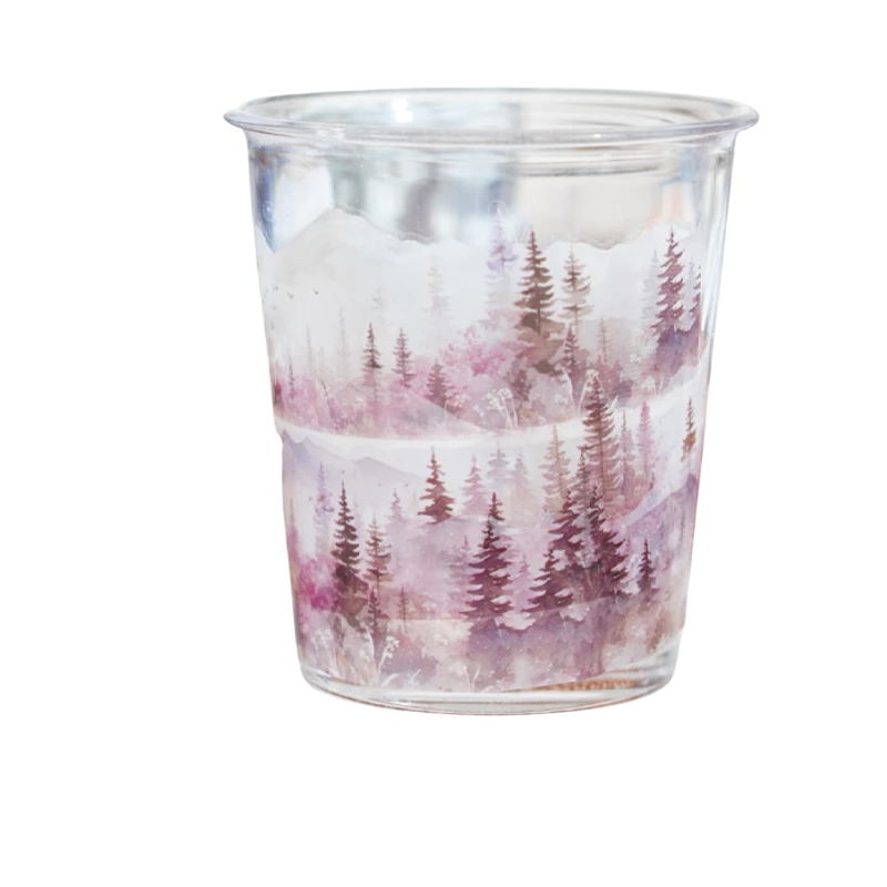 Bandă decorativă rezistentă la apă cu motiv de munți și păduri pentru proiecte DIY, decorarea caietelor, cănilor și jurnalelor, aplicare ușoară și aspect curat. Descrierea completă