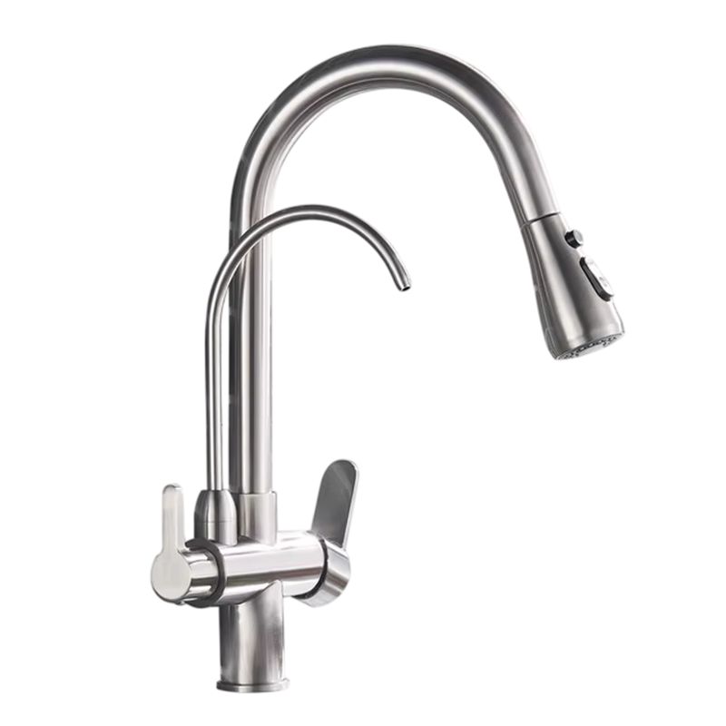 Această baterie de bucătărie cu braț retractabil este soluția ideală pentru bucătăriile moderne, unde se pune accent pe funcționalitate, economisirea timpului și confort. Datorită jetului rotativ la 360° și opțiunilor de amestecare a apei calde și reci, se utilizează cu maxim confort. Sistemul de filtrare va asigura că apa dumneavoastră va fi întotdeauna curată, ceea ce este deosebit de important pentru prepararea mâncării sau băuturilor. Robinetul este conceput pentru instalare ușoară, facilitând montajul chiar și în gospodării fără ajutor specializat. Acest model oferă un design practic și o performanță de încredere, ceea ce îl face un complement ideal pentru bucătăria dumneavoastră.