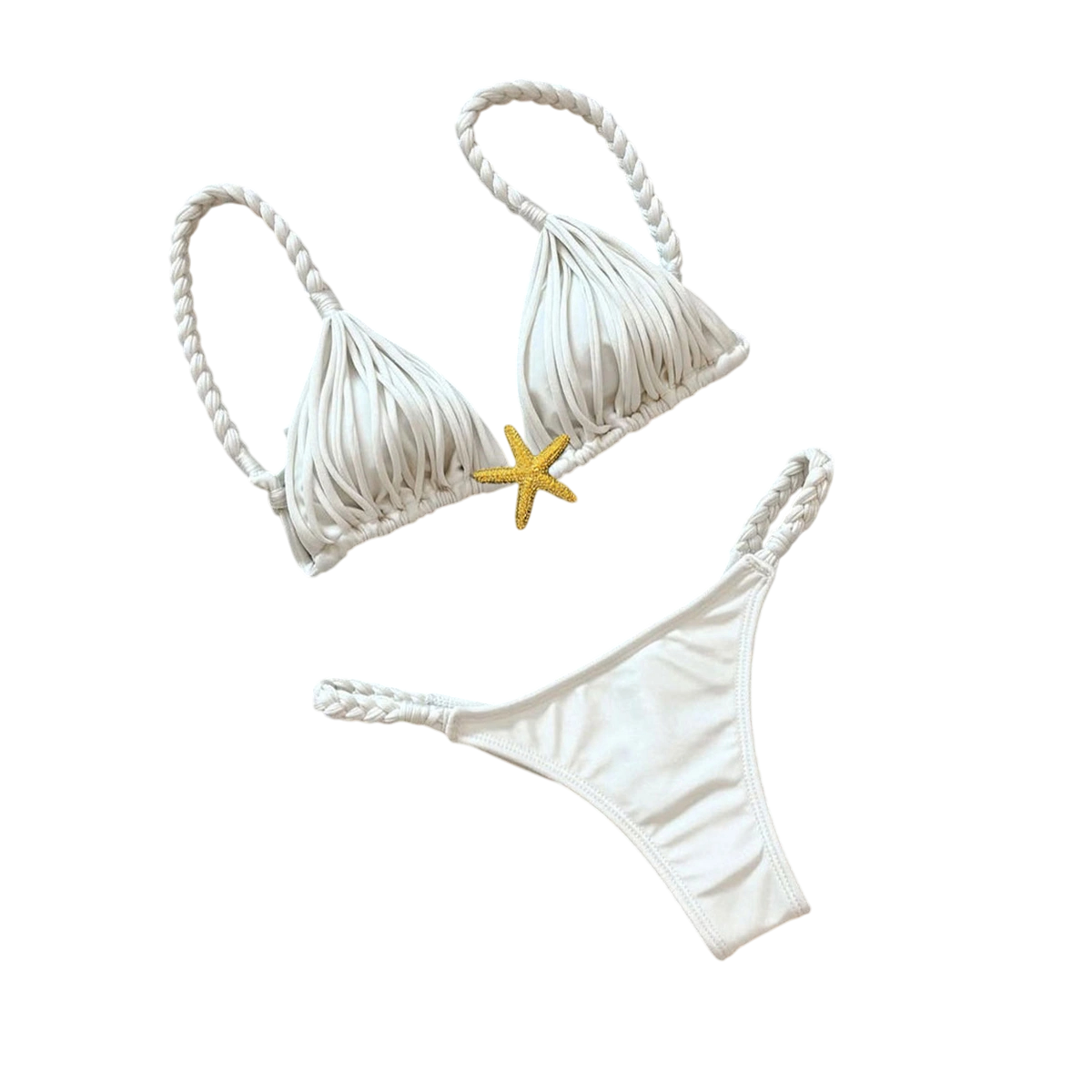 Bikini elegant cu bretele împletite, top triunghi cu franjuri și decor în stele de mare, perfect pentru zilele de plajă și ședințe foto. Descrierea completă