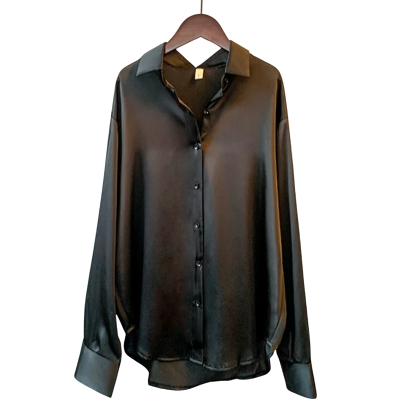Bluză de damă din satin cu mâneci lungi Cămașă elegantă Croială lejeră Închidere cu nasturi Material ușor și strălucitor pentru zi și seară