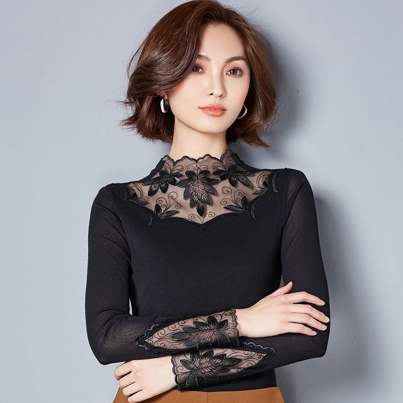 Bluză elegantă cu mâneci lungi. Are o țesătură translucidă de la decolteu până la gât.