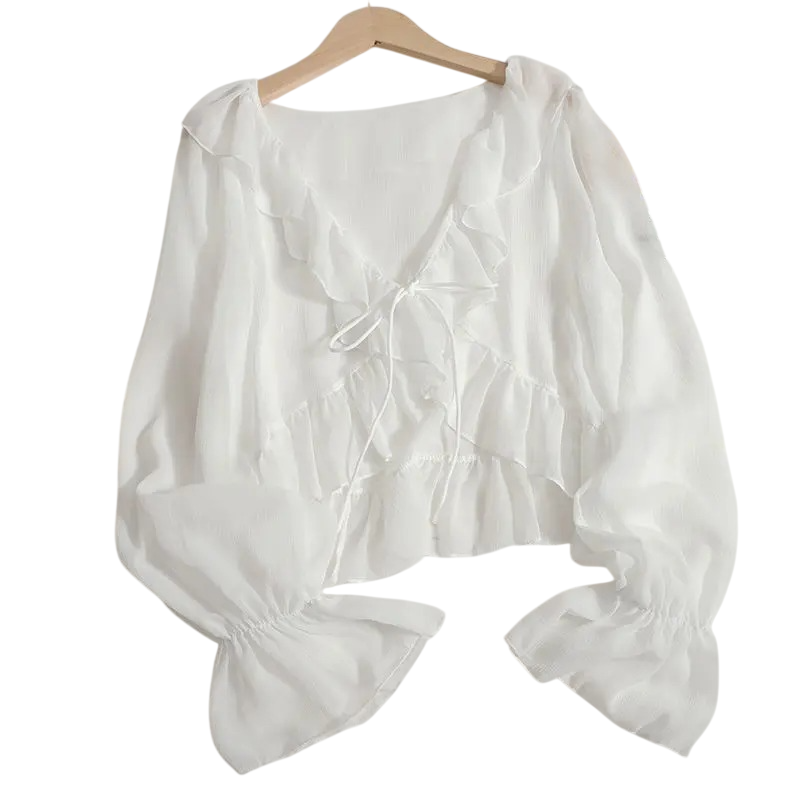 Pagina de start Pagina de start Îmbrăcăminte şi accesorii Femei Bluze de damă Bluze femei cu mâneci lungi Bluză pentru femei cu decolteu în V Mâneci lungi Semi-transparentă Croi lejer Făcături Legare cu șnur Uni