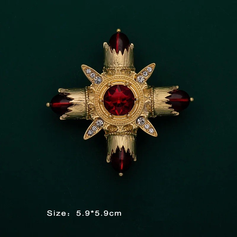 Broșa este fabricată din aliaj de zinc, apreciat pentru stabilitatea sa dimensională și posibilitatea de prelucrare detaliată. Suprafața de culoare aurie are un aspect elegant și se combină ușor cu alte bijuterii sau accesorii. Pietrele decorative roșii și verzi oferă profunzime, contrast și un caracter distinctiv bijuteriei. Datorită stilului baroc, broșa este o alegere ideală pentru iubitorii de accesorii expresive și originale. Poate fi prinsă pe sacou, palton, rochie, eșarfă sau geantă și va crea întotdeauna un element vizual atrăgător.