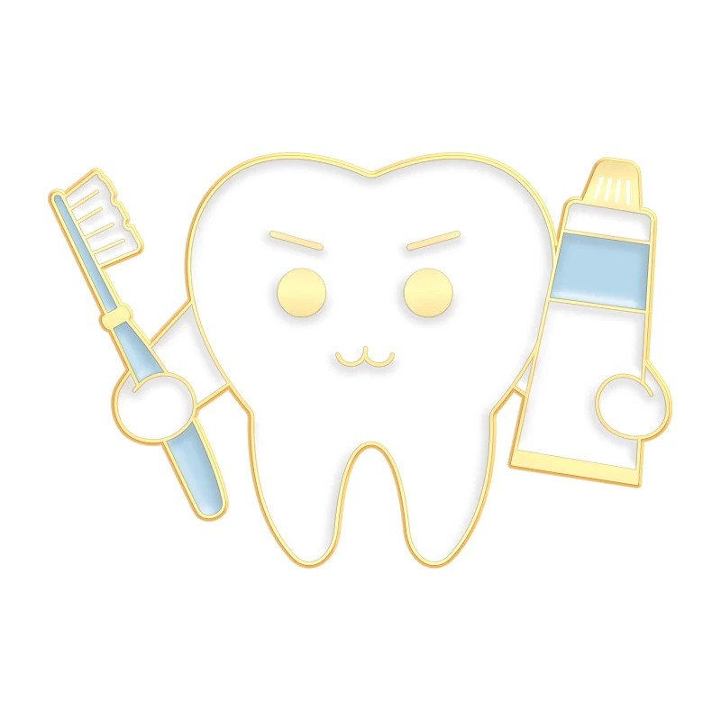 Această broșă sub formă de pin ilustrează un motiv de dinte completat cu o față simplă. Dintele are o expresie blândă cu ochi și un zâmbet, care dă o notă prietenoasă și discretă. Datorită execuției curate și liniilor simple, designul este ușor de recunoscut.