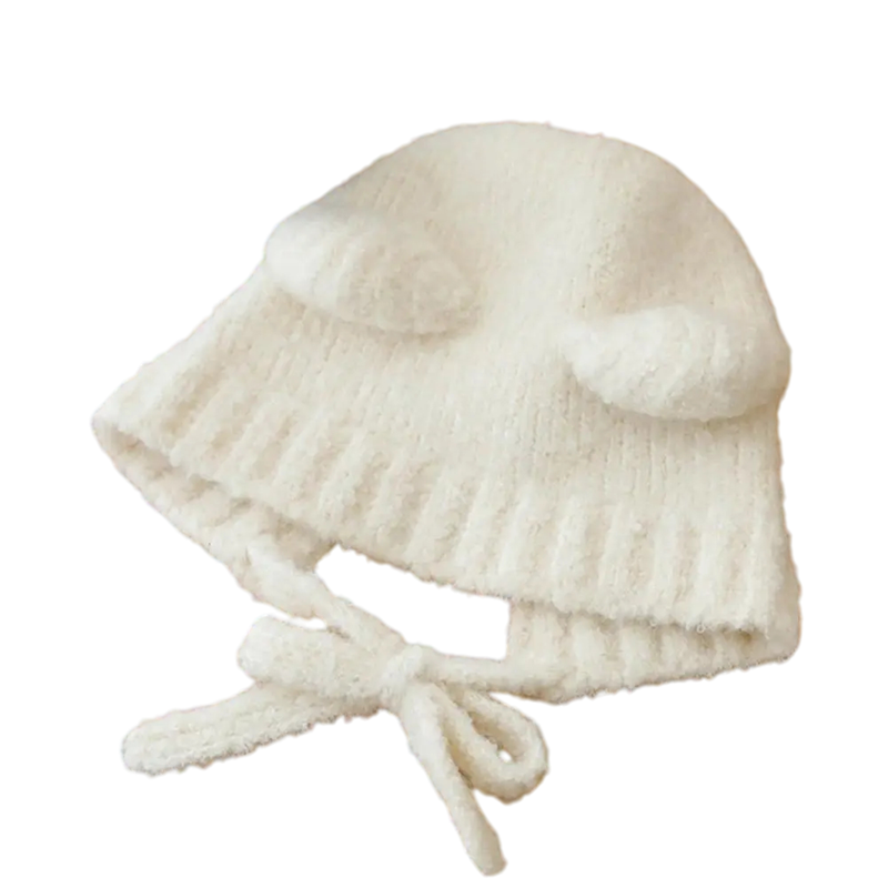 Căciulă drăguță de iarnă cu urechi de urs și șnururi pentru legare sub gât. Pluș moale, tricot călduros și mărime confortabilă pentru zilele reci. Descrierea completă