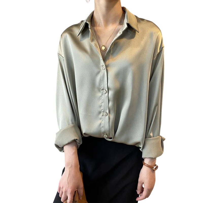 Cămașă elegantă din satin pentru femei cu guler Croi liber cu nasturi Bluză uni din poliester Top stilat pentru birou și timp liber