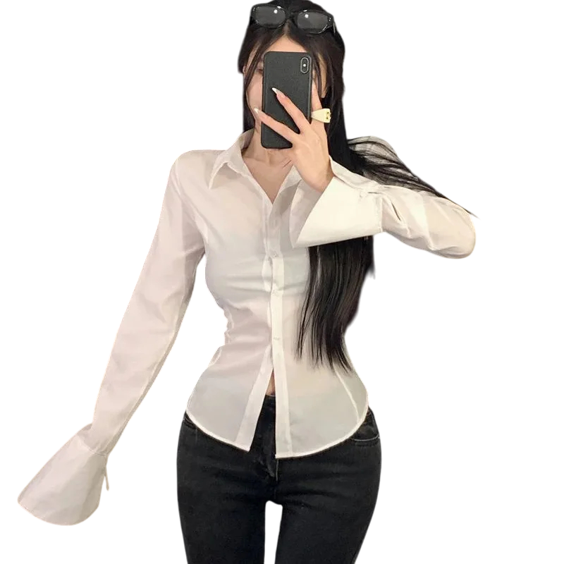 Pagina de start Pagina de start Îmbrăcăminte şi accesorii Femei Cămăși de damă Cămăşi casual pentru femei Cămașă elegantă pentru femei cu guler Cămașă uni cu șnur la spate Mâneci lărgite Top elegant din poliester ușor