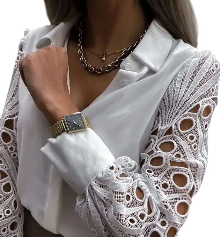 Datorită designului său, această cămașă combină eleganța clasică cu o notă modernă, adusă de detaliile din dantelă. Materialul din poliester este ușor și respirabil, asigurând un confort ridicat la purtare pe parcursul întregii zile. Mânecile din dantelă creează un accent discret, dar eficient, care subliniază feminitatea și delicatețea. Cămașa se combină ușor cu blugi, fuste sau pantaloni eleganți, ceea ce o face un articol versatil potrivit pentru orice ocazie. Ideală pentru femeile care doresc să arate elegant, să se simtă confortabil și să fie stilate – la muncă, la întâlniri sau în zilele libere.