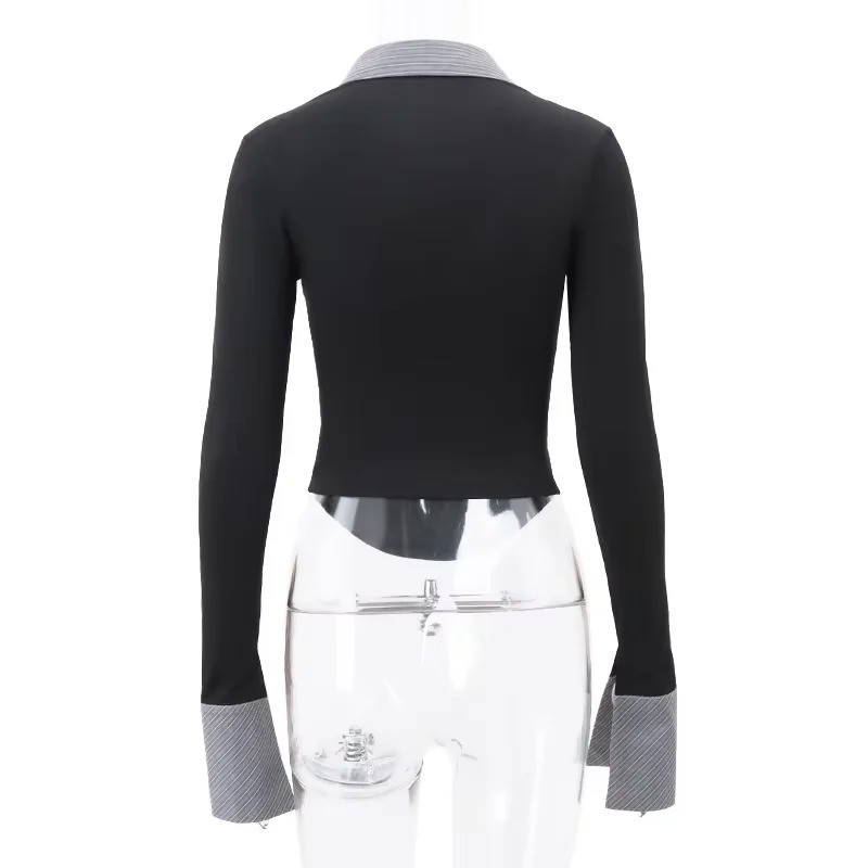 Top negru cu mânecă lungă din poliester oferă un aspect elegant, întreținere ușoară și confort pentru purtarea zilnică sau urbană. Descrierea completă