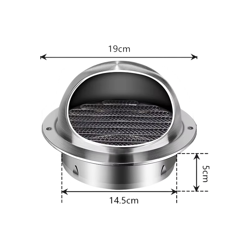 Pagina de start Pagina de start Casă Ventilatoare si racitoare aer Ventilatoare Capac rotund pentru ventilator 150 mm 19x5x14,5 cm Oțel inoxidabil Grilaj de ventilație rezistent la apă Orificiu de evacuare montat pe perete Etanșare împotriva umidității