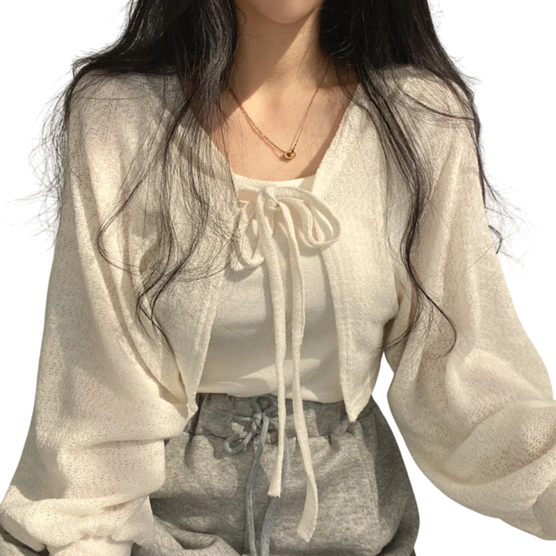 Cardigan de vară pentru femei cu mâneci lungi și legare cu șnur Pulover ușor din acetat, poliester și viscoză Top elegant de exterior