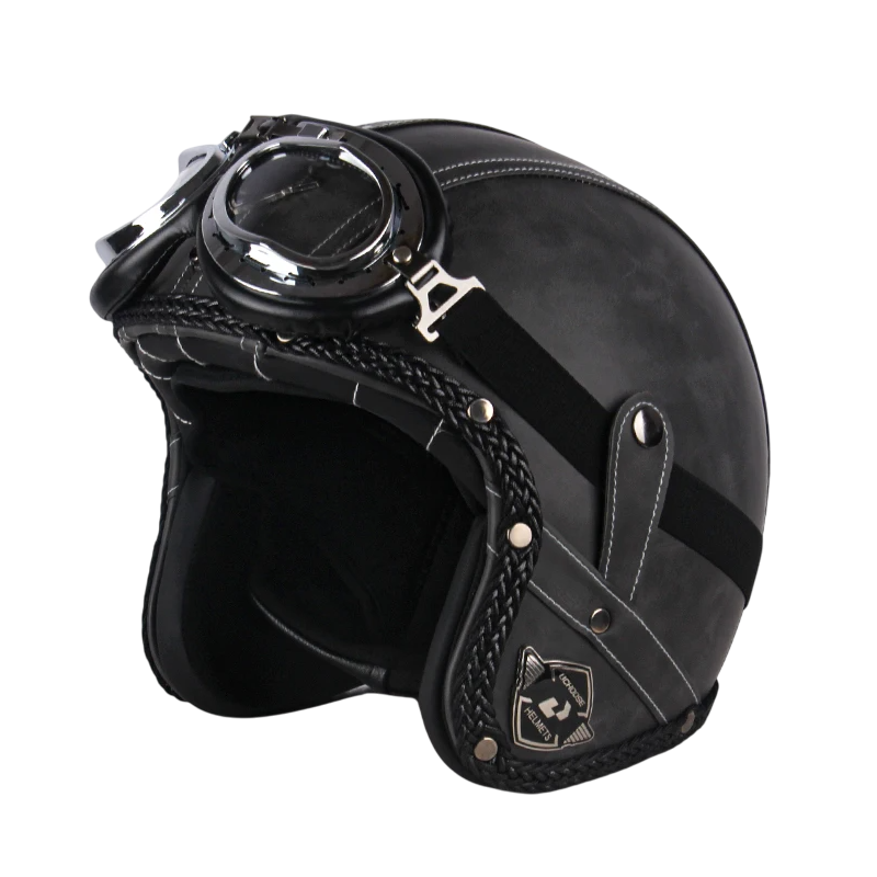 O cască retro elegantă cu aspect de piele și ochelari de protecție asigură siguranță și eleganță în timpul fiecărei călătorii cu motocicleta. Descrierea completă