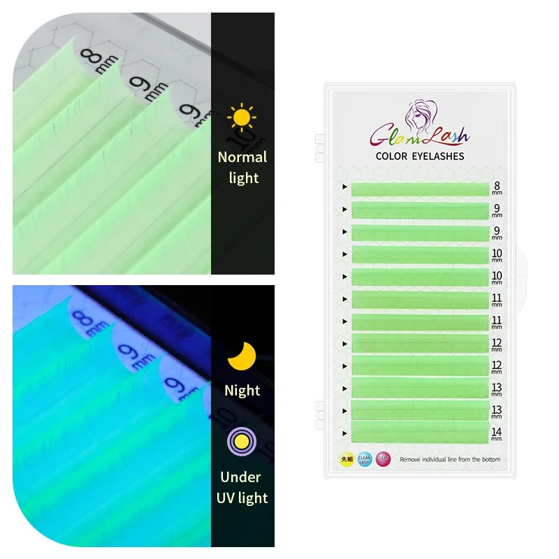 Cilindrice colorate UV strălucitoare individuale false cu curbura C 8–14 mm grosime 0,07 mm Gene adezive neon pentru extensii voluminoase
