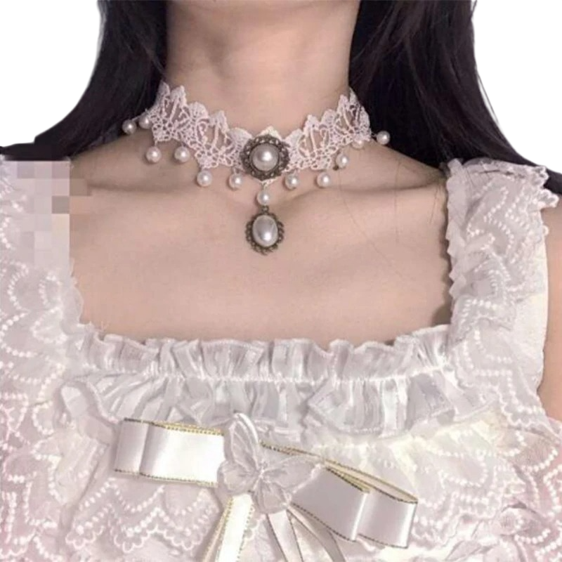 Colier choker din dantelă pentru femei cu pandantiv și decorațiuni din perle cu închidere dantelă albă bijuterie elegantă pentru purtare festivă
