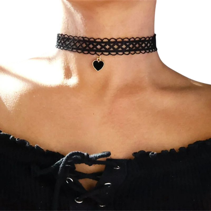 Colier choker negru pentru femei cu dantelă și pandantiv în formă de inimă, cu închidere, accesoriu elegant pentru purtare zilnică și ocazii festive