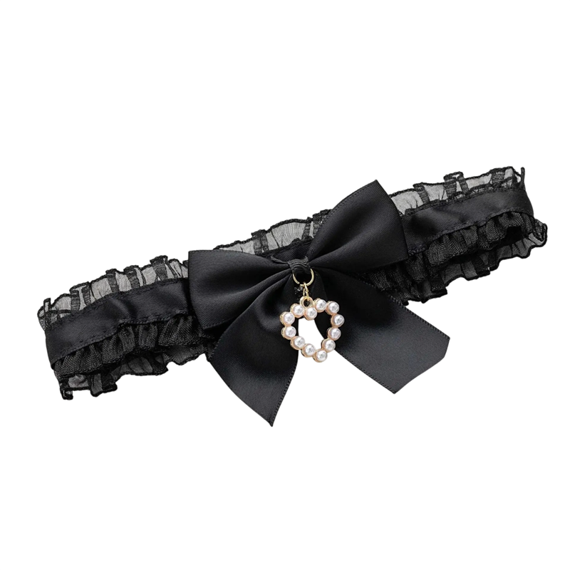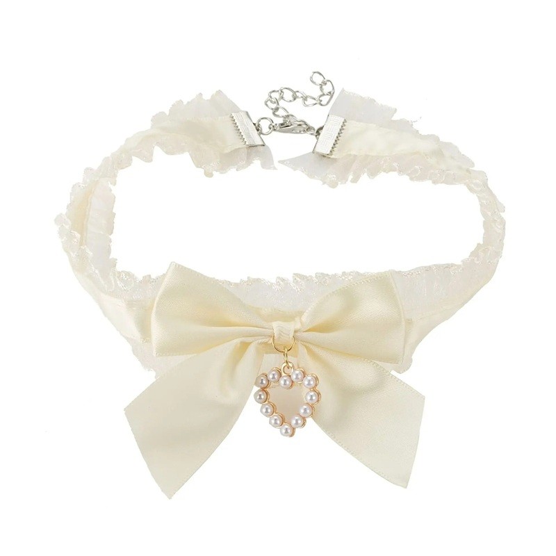 Colierul din dantelă se potrivește atât cu îmbrăcămintea de ocazie, cât și ca accesoriu pentru un stil mai îndrăzneț. Elementul dominant este fundița, completată de un pandantiv din perlă în formă de inimă, care conferă întregului ansamblu un caracter decorativ. Structura fină a dantelei creează un contrast interesant cu fundița netedă.