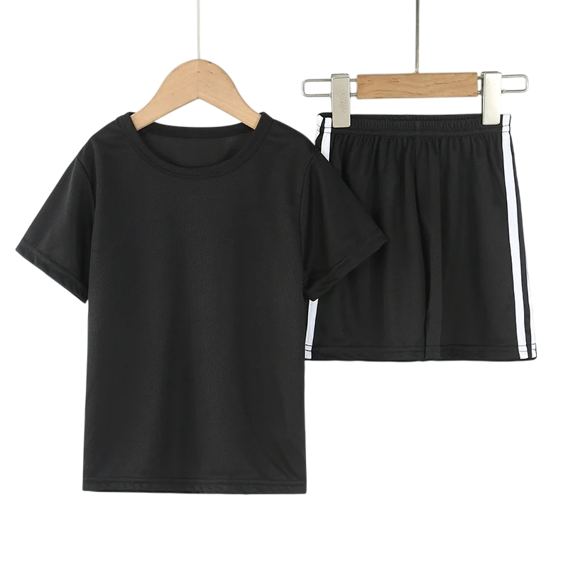 Tricoul este dotat cu gât O, care este confortabil și nu limitează în timpul îmbrăcării sau purtării. Mânecele scurte și materialul ușor contribuie la o bună respirabilitate chiar și în timpul activităților fizice intense. Pantalonii scurți au talie elastică, care se adaptează formei corpului copilului și asigură o purtare confortabilă fără a strânge. Croiala pantalonilor scurți permite mișcare liberă în timpul alergării, săriturilor și jocului. Întregul complet are un aspect sportiv, simplu și funcțional.
