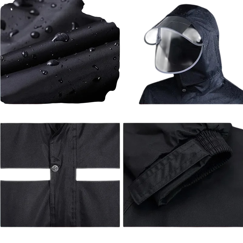 Costumul de ploaie pentru motocicletă este destinat riderilor care au nevoie de protecție fiabilă în condiții meteorologice nefavorabile, indiferent de lungimea traseului. Combinația dintre jachetă și pantaloni formează un întreg funcțional, care ajută la protejarea îmbrăcămintei de ploaie și vânt. Aspectul simplu, de culoare neagră, este completat de un design reflexiv cu părți divizate, care crește vizibilitatea în trafic. Costumul este conceput ca unisex, astfel că este potrivit pentru un spectru larg de utilizatori. Datorită construcției practice, este potrivit pentru navetă de zi cu zi, dar și pentru plimbări mai lungi.