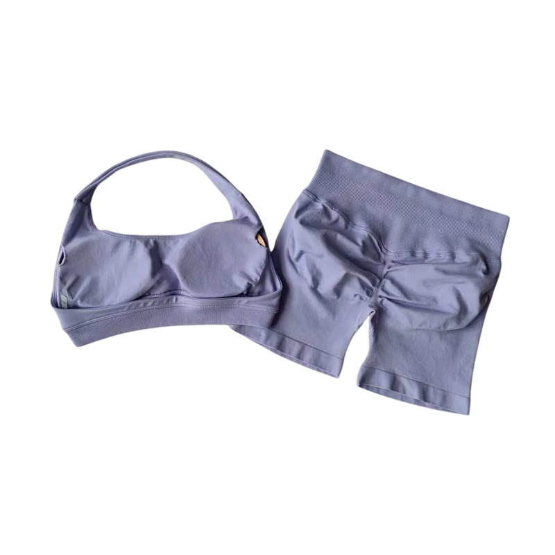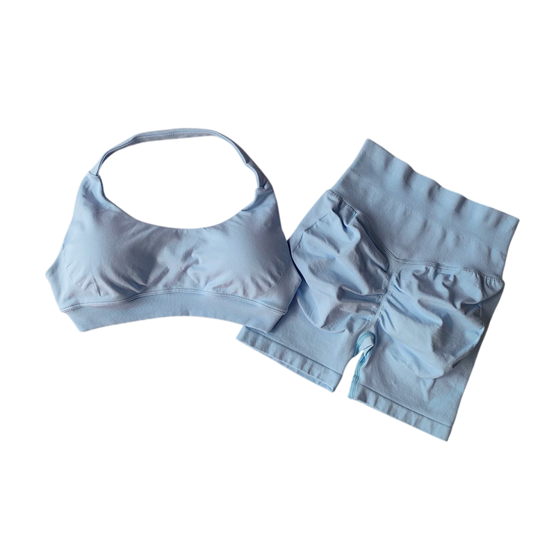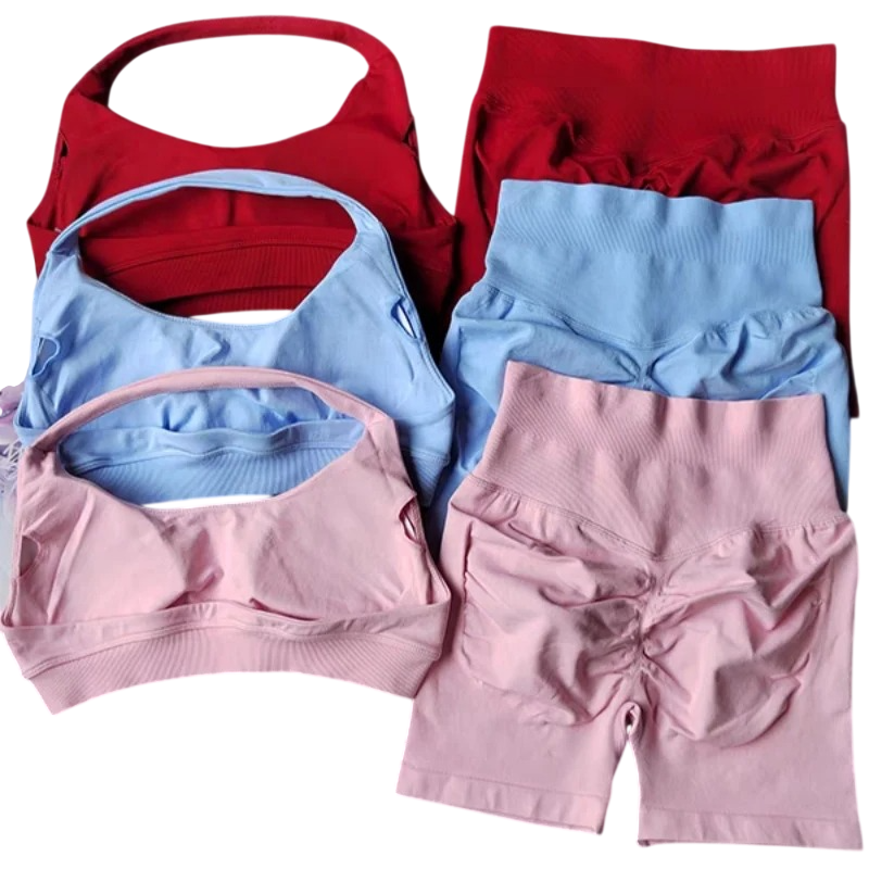 Costum sportiv de damă cu pantaloni scurți și sutien sport, într-o singură culoare, nylon, spandex, confortabil și stilat pentru fitness și exerciții
