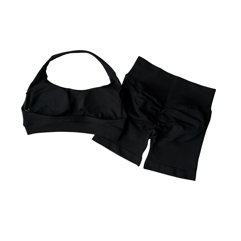 Costum sportiv de damă cu pantaloni scurți și sutien sport din nylon și spandex. Design simplu, ideal pentru fitness, exerciții sau timp liber, material confortabil și elastic. Descrierea completă
