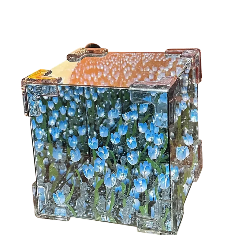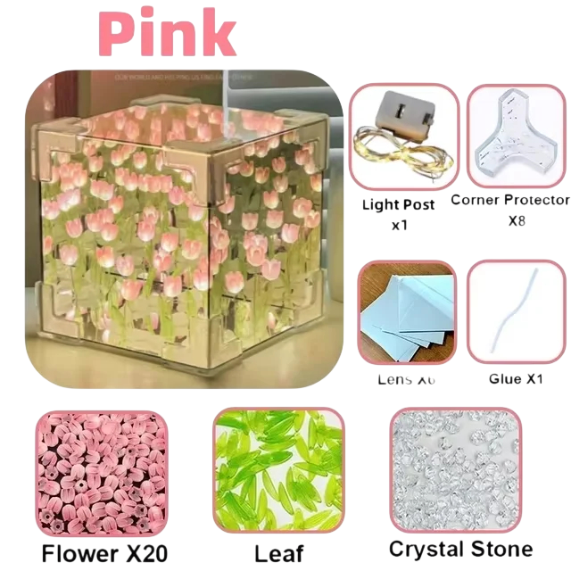 În interiorul cubului se află 20 de lalele realiste, care sunt completate de luminițe LED delicate. Iluminarea creează o atmosferă plăcută de relaxare, potrivită pentru odihna de seară. Produsul oferă un design DIY creativ, care este modern și decorativ în același timp. Datorită dimensiunii compacte, lampa poate fi ușor amplasată pe noptieră, raft sau birou. Designul transparent permite observarea decorației florale din toate unghiurile.
