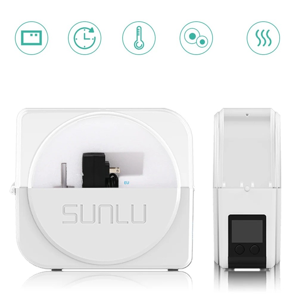 Temperatura de uscare este reglabilă în intervalul 35–55 °C, astfel încât condițiile pot fi ușor adaptate pentru diferite tipuri de filamente. Cronometrul permite setarea uscării de la 0 la 24 de ore, în funcție de gradul de umiditate al materialului și de preferințele personale. În interiorul dispozitivului sunt amplasate două senzori de temperatură – unul monitorizează temperatura aerului din cutie, iar celălalt temperatura elementului de încălzire. Datorită acestui fapt, măsurarea este precisă, încălzirea este sigură, iar temperatura nu se supraîncălzește. Construcția interioară asigură o învăluire uniformă a bobinei cu căldură, așa-numita „coacere învelită“, care duce la o uscare mai uniformă și la o păstrare mai bună a căldurii. Este inclus un cablu de alimentare cu mufă pentru priza europeană.
