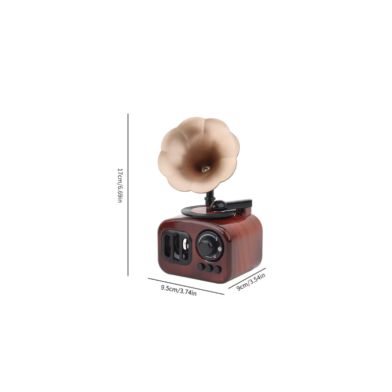 Cutie muzicală stilată cu design retro de gramofon. Redare mecanică fără baterii, potrivită ca decor sau cadou mic. Descrierea completă
