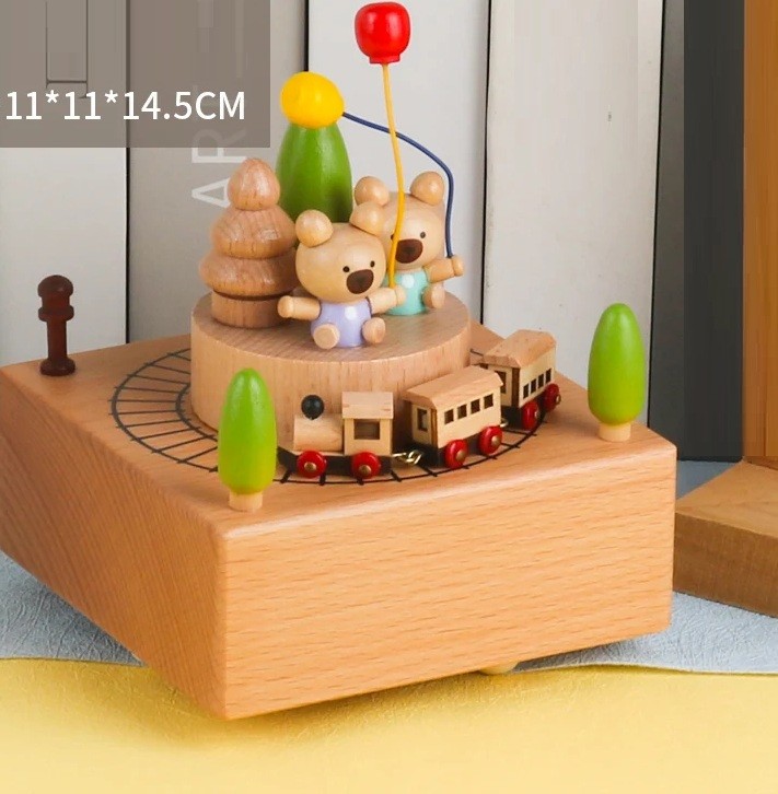 Cutie muzicală din lemn cu ursuleți, baloane, trenuleț, scenă, mecanism manual 11 × 11 × 14,5 cm, decor din lemn