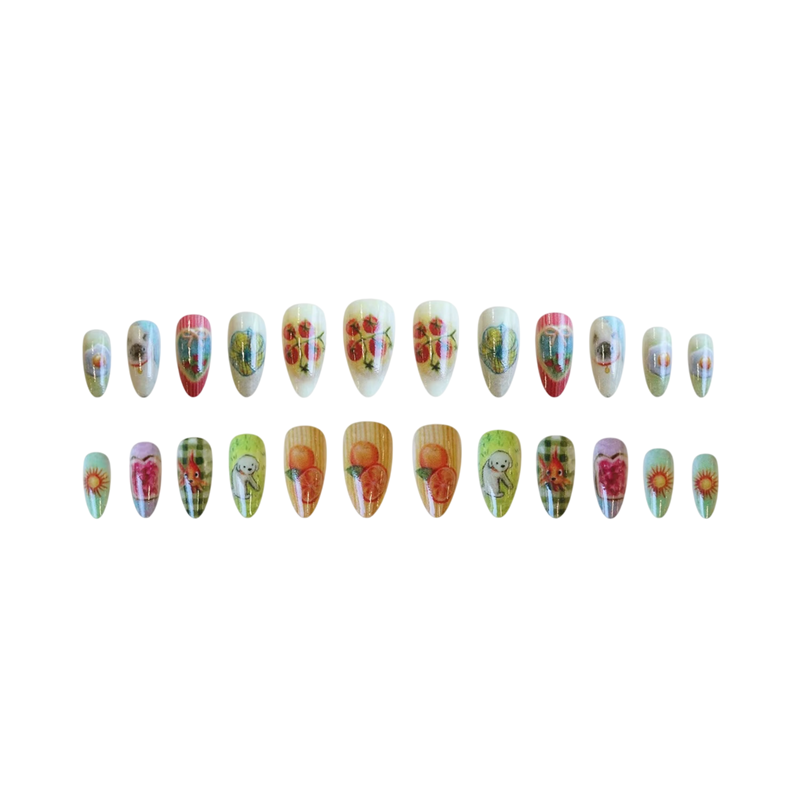 Această decorațiune pentru manichiură este alegerea ideală pentru oricine dorește să aibă mâini îngrijite fără îngrijire complicată și consumatoare de timp. În pachet vei găsi 24 de unghii false lucioase, care atrag atenția prin modelele lor drăguțe și moderne. Datorită 12 dimensiunilor diferite în intervalul 25,6 până la 18,3 mm, este ușor să alegi varianta cea mai potrivită pentru fiecare deget. Forma migdală dă un aspect elegant, natural și alungește optic degetele. Unghiile pot fi tăiate și pilite fără probleme la lungimea și forma dorită.
