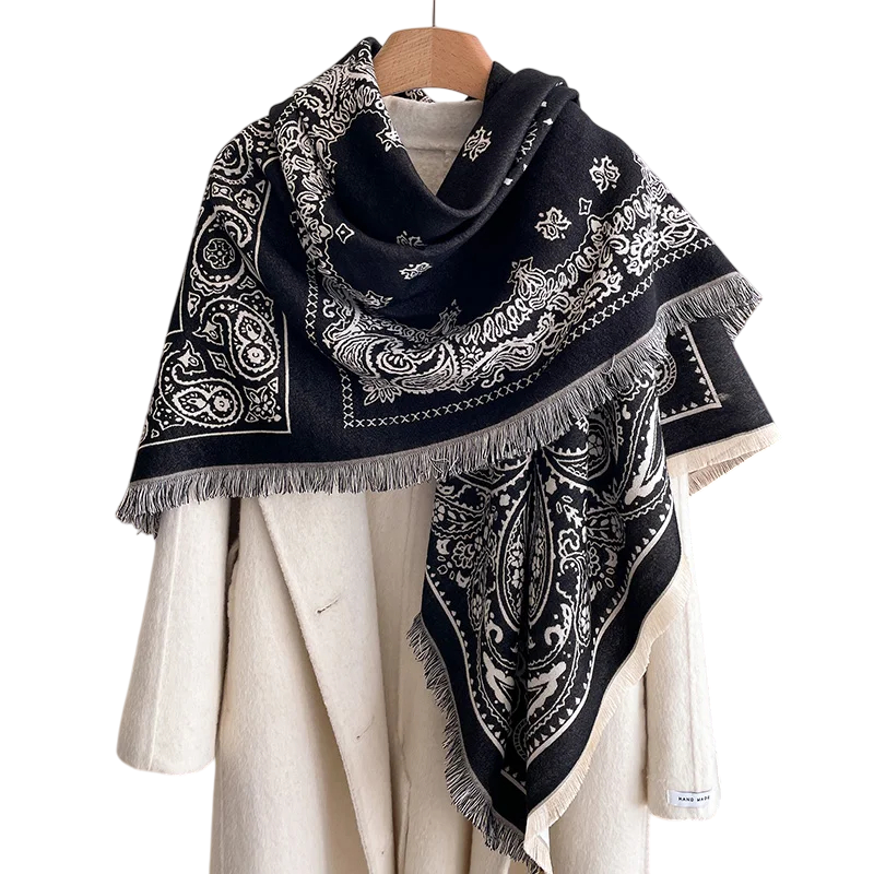 - Margini franjurate care oferă eșarfei un aspect elegant