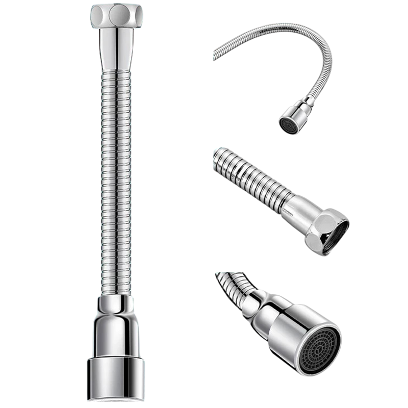 Extensia din oțel inoxidabil pentru robinet cu furtun flexibil este un accesoriu practic destinat bateriilor și chiuvetelor de bucătărie. Acest adaptor de extensie ajută la extinderea razei de acțiune a jetului de apă și permite direcționarea ușoară a acestuia în timpul utilizării normale a chiuvetei. Datorită construcției flexibile, jetul de apă poate fi direcționat către diferite părți ale chiuvetei.