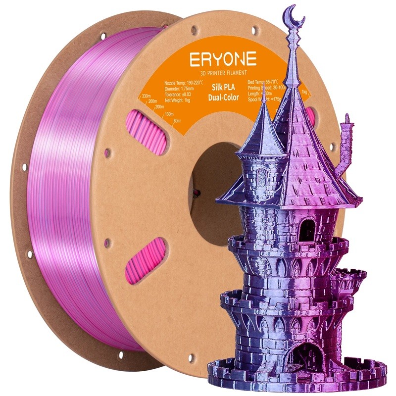 Filamentul dublu din mătase în combinație de roz și violet aduce un efect de culoare delicat, dar pronunțat, care conferă modelelor imprimate un aspect impresionant și elegant. Tranziția lină între nuanțele deschise și cele mai închise creează o impresie atrăgătoare de adâncime, care se evidențiază în special pe formele conturate, curbe sau decorative. Structura de suprafață mătăsoasă oferă un luciu puternic, care uniformizează suprafața și ajută în același timp la ascunderea straturilor, astfel încât imprimările rezultate să aibă un aspect profesional fără a necesita modificări suplimentare. Materialul PLA, a cărui denumire este în română o abreviere folosită frecvent pentru polilactid, este ușor de imprimat, stabil și potrivit pentru sarcini de imprimare detaliate sau extinse. Diametrul de 1,75 mm și toleranța ± 0,03 mm susțin un flux consistent de material și o calitate uniformă a imprimării.