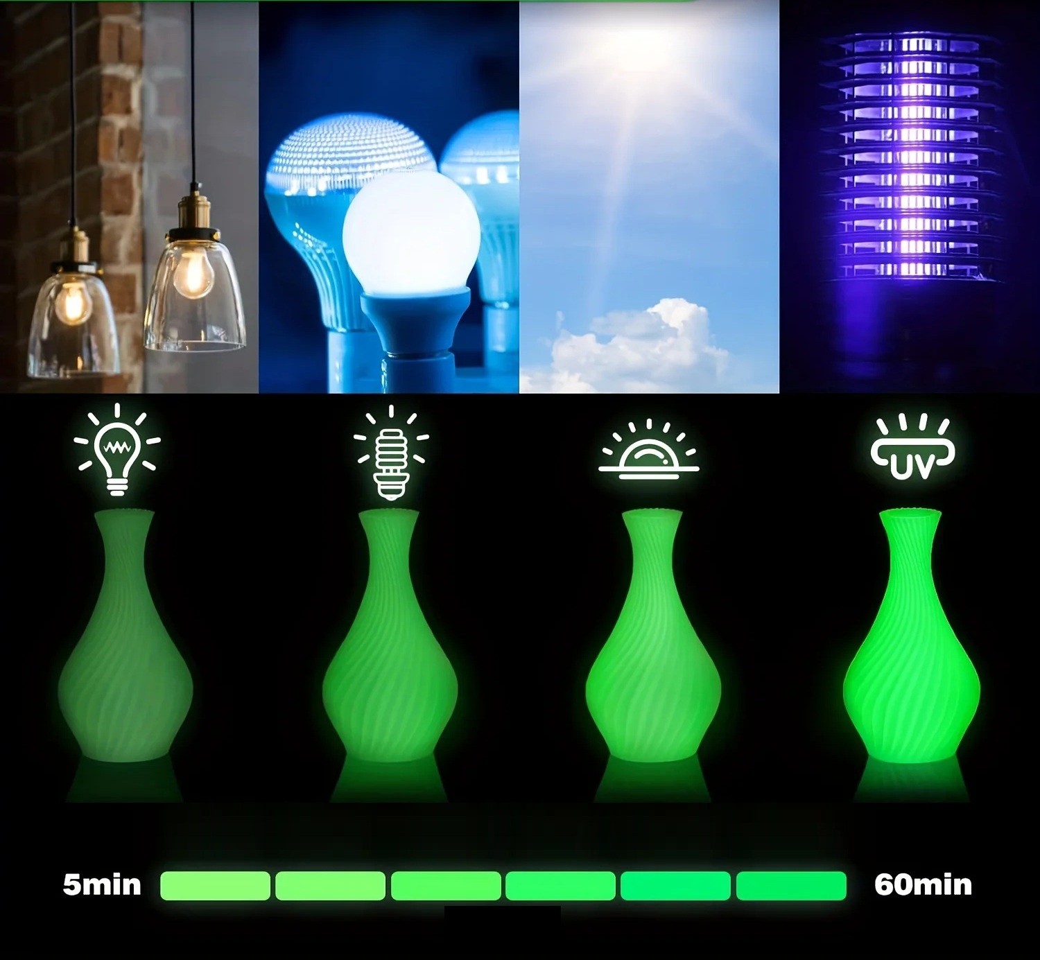 PLA luminescent: Doar 20 de minute de expunere la lumina solară puternică, lumină UV sau lanternă vor crea un efect vizibil de strălucire, iar după 30 de minute de expunere, strălucirea va dura și mai mult.