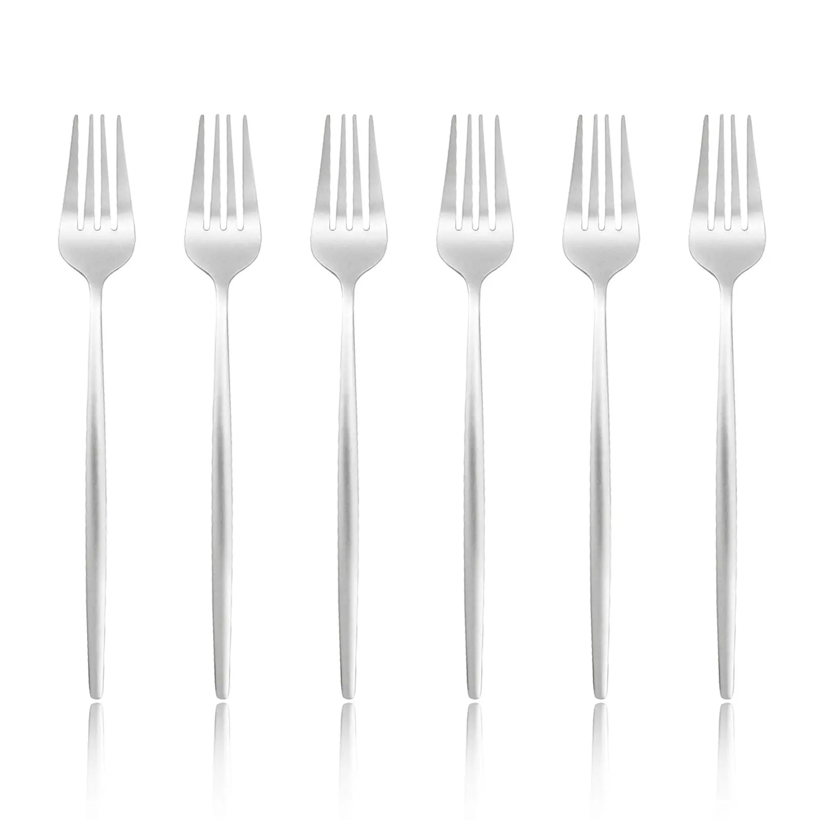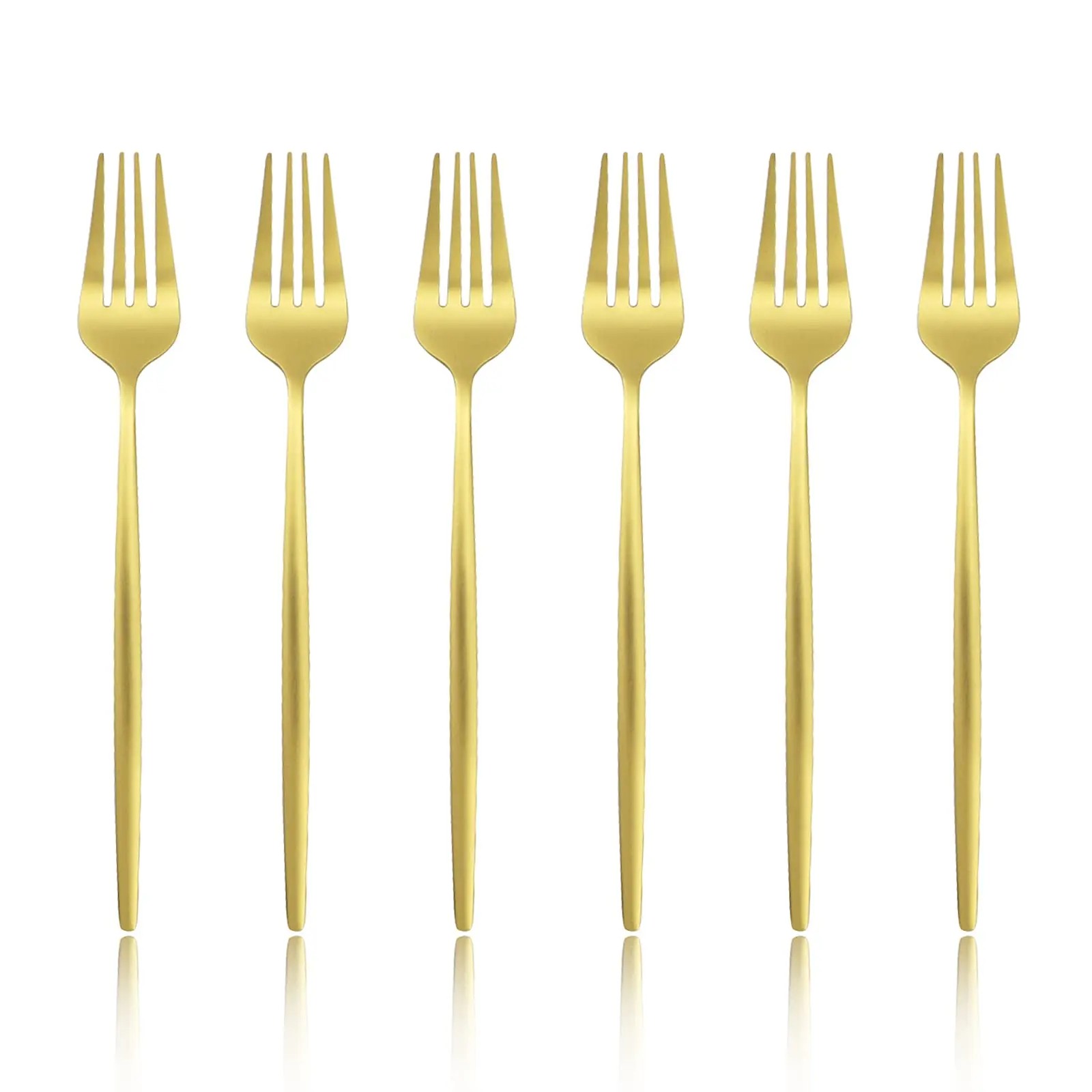 Setul de furculițe din oțel inoxidabil este destinat utilizării zilnice la mese. Datorită lungimii de 20,8 cm, furculițele se prind confortabil și sunt potrivite pentru consumul diferitelor tipuri de preparate. Designul argintiu sau auriu completează aspectul simplu și modern al tacâmului. Setul conține șase bucăți de furculițe, care pot fi utilizate atât la mesele obișnuite, cât și la servirea preparatelor. Acest tip de tacâm poate fi un accesoriu practic pentru echipamentul de bucătărie.