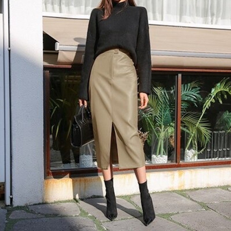 Fustă lungă din piele pentru femei, cu fantă