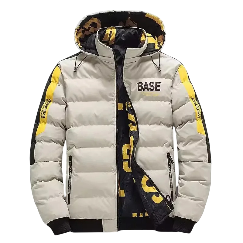Jachetă elegantă de iarnă pentru bărbați, cu glugă, inscripție pe mâneci, căptușeală și închidere cu fermoar. Ideală pentru oraș și pentru timpul liber pe vreme rece. Descrierea completă