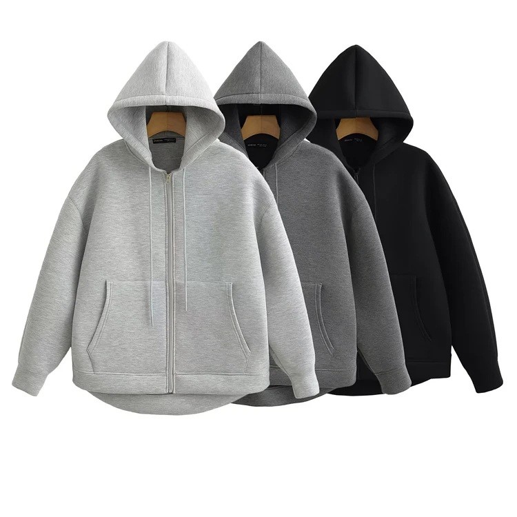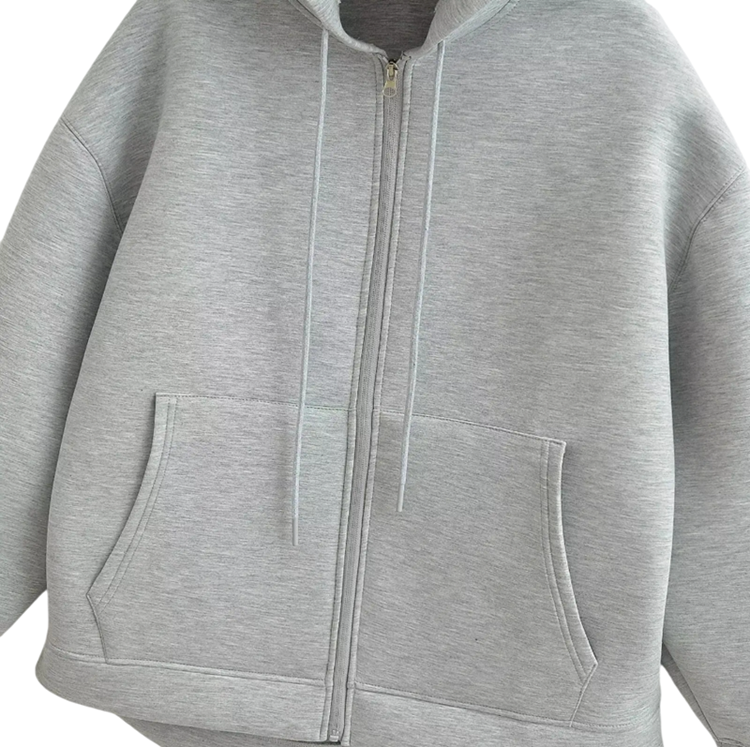 Hanorac stylish pentru damă, cu glugă, fermoar și buzunare din poliester moale, ideal pentru timpul liber, sport sau purtare zilnică confortabilă. Descrierea completă