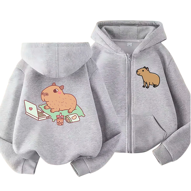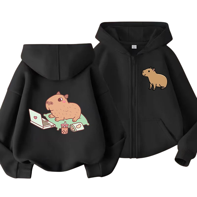 Hanorac stylish pentru copii cu fermoar, glugă și motiv de capibara în stil kawaii. Poliester moale, buzunare practice, potrivit pentru băieți și fete, diverse culori. Descrierea completă