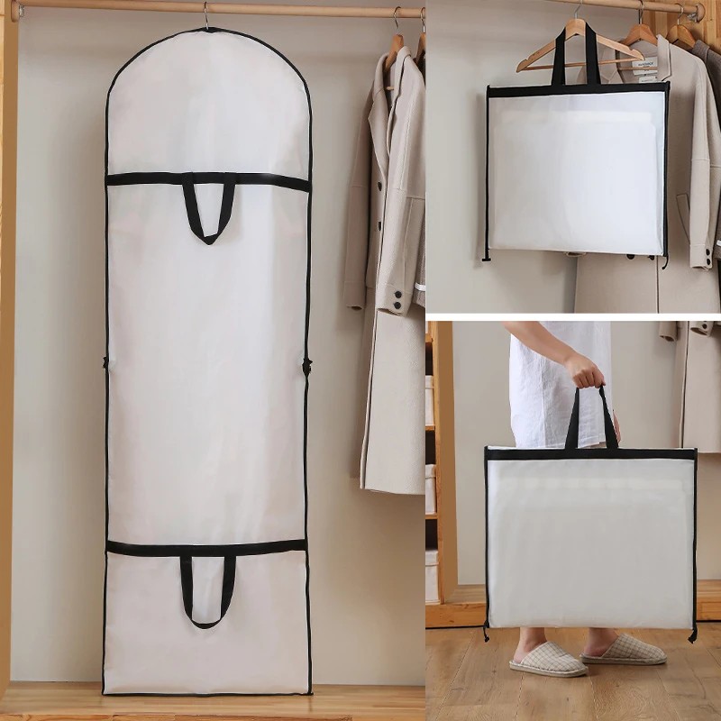 Husa include și mânere rezistente, care permit transportul ușor sau plierea husei pentru economisirea spațiului. Husa poate fi pliată într-o formă compactă folosind curelele integrate, așa cum arată fotografiile atașate. Construcția este concepută pentru a menține îmbrăcămintea protejată, dreaptă și fără cute. Datorită suprafeței impermeabile, este potrivită pentru depozitarea pe termen lung a îmbrăcămintei acasă sau în timpul călătoriilor.
