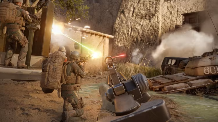 • Luptați pe hărți vaste în moduri de joc pentru până la 16 jucători împotriva altor 16 jucători sau în cooperare cu 8 jucători împotriva AI-ului, acum cu vehicule mobile echipate cu mitraliere.